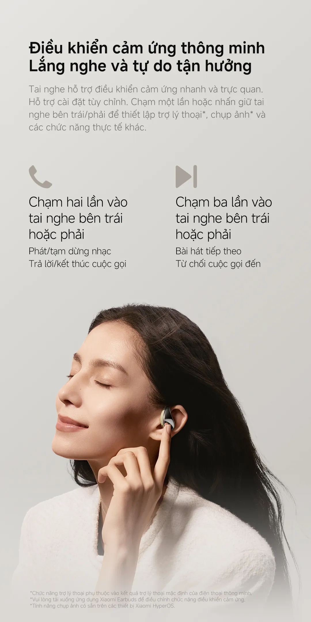 Tiện ích “Chia sẻ âm thanh” cho phép đồng thời kết nối hai cặp tai nghe với cùng một thiết bị, giúp bạn chia sẻ trải nghiệm nhạc hoặc phim ngay lập tức. Ngoài ra, Xiaomi OpenWear còn hỗ trợ điều khiển cảm ứng đa chức năng: