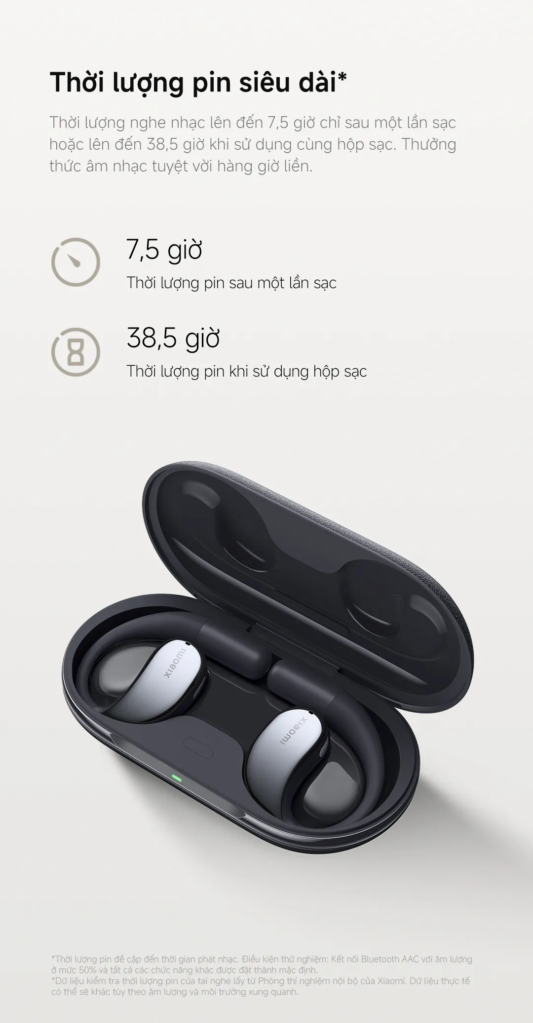 Cùng với thời gian nghe nhạc một lần sạc lên đến 7,5 giờ, Xiaomi OpenWear còn đi kèm hộp sạc hỗ trợ pin siêu dài cho tới 38,5 giờ. Điều này đồng nghĩa với việc người dùng có thể thưởng thức âm nhạc liên tục trong một tuần mà không cần lo lắng về nguồn năng lượng.