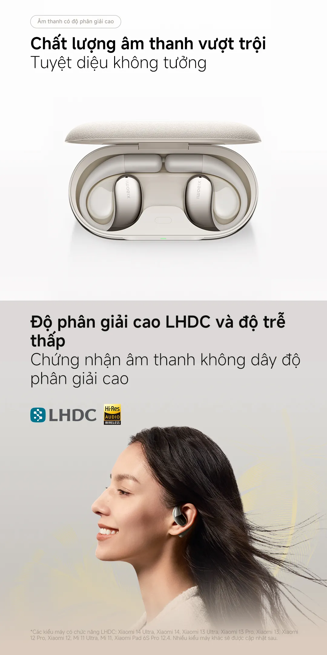 Xiaomi OpenWear tích hợp công nghệ LHDC Hi-Res Audio Wireless, giúp truyền tải dữ liệu âm thanh với tốc độ nhanh hơn 3 lần so với AAC, đồng thời giảm độ trễ xuống mức tối thiểu. Kết hợp với driver điện động kích thước 17 × 12 mm và một driver 10 mm đặc biệt chống rò rỉ, người dùng sẽ được trải nghiệm âm thanh trung thực, sâu sắc.