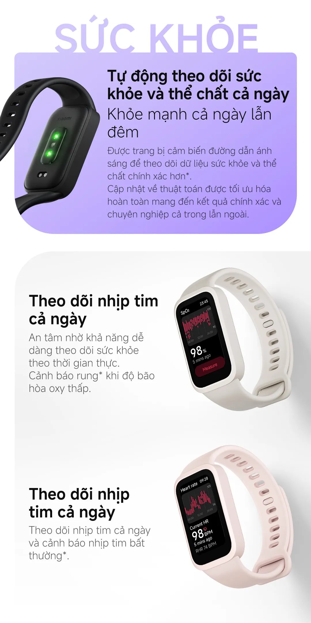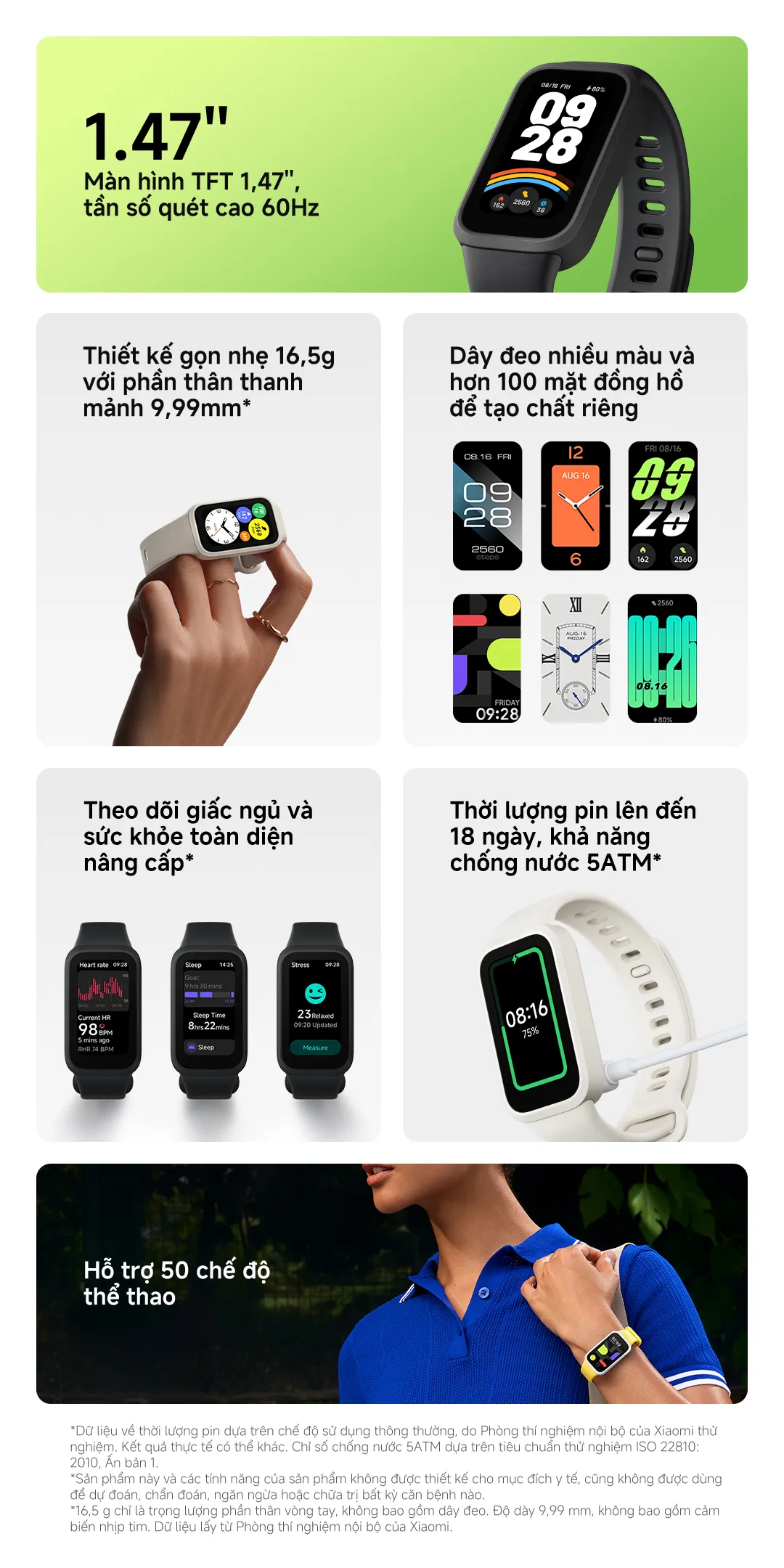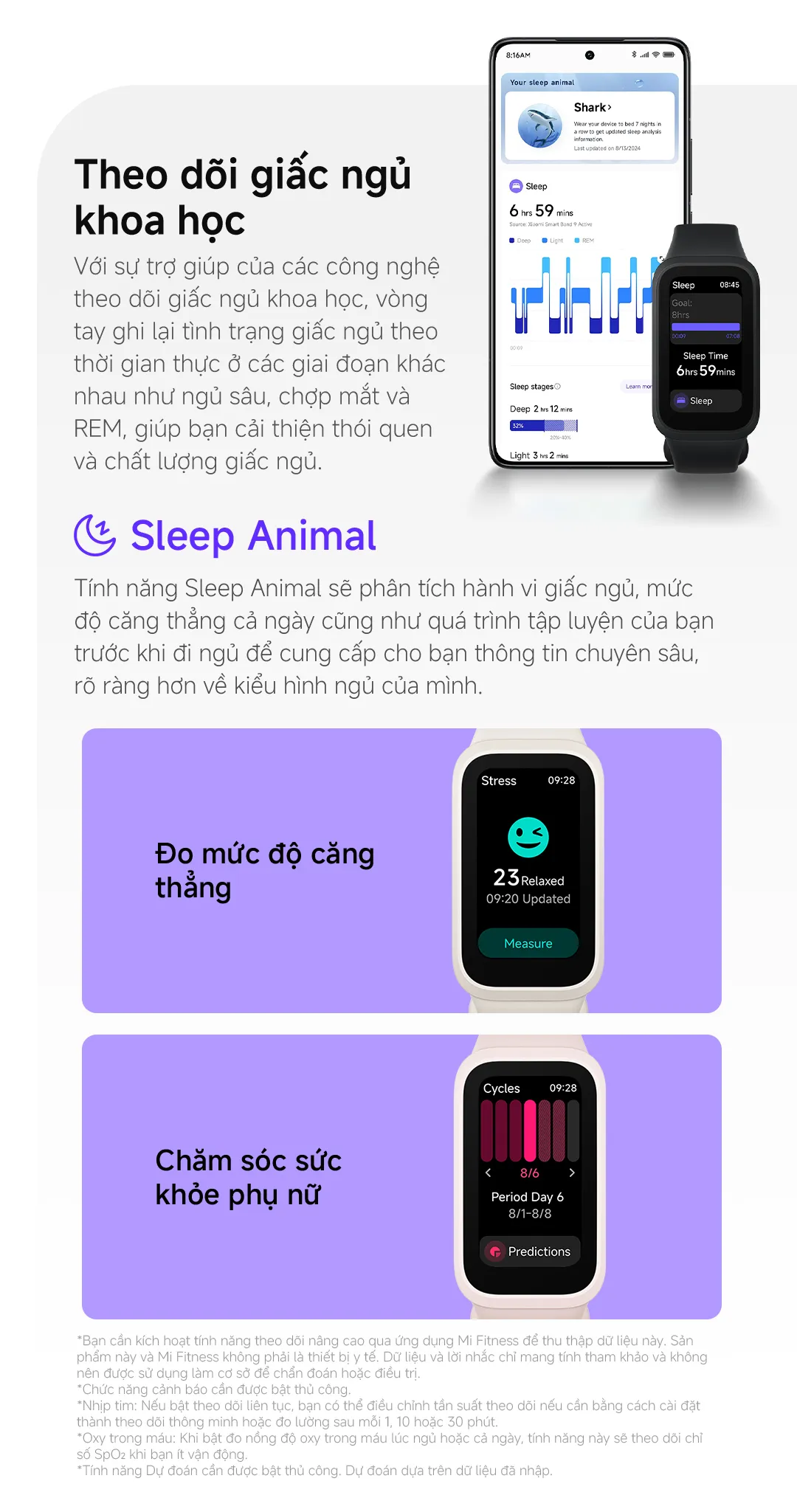 Mặc dù Xiaomi Smart Band 9 Active được trang bị nhiều tính năng tiên tiến, nhưng sản phẩm này không được thiết kế để thay thế các thiết bị y tế chuyên nghiệp. Các số liệu như nhịp tim, bão hòa oxy chỉ mang tính chất tham khảo và không được sử dụng cho mục đích chẩn đoán bệnh.