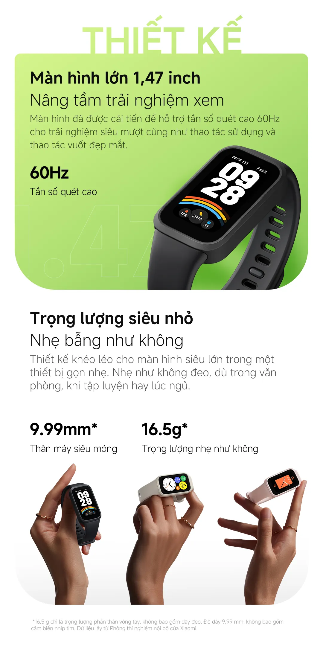 Bảo vệ một trong những yếu tố quan trọng nhất khi bạn đang tìm kiếm một chiếc Smart Band phù hợp, Xiaomi Smart Band 9 Active đáp ứng ngay nhu cầu của người dùng với khối lượng chỉ 16,5g (không tính dây đeo). Đặc biệt, độ dày thân máy giảm xuống còn 9,99mm – một mức mà hầu hết các vòng tay thông minh hiện nay chưa đạt được. Kết hợp cùng thiết kế mỏng nhẹ và mặt lưng bằng vật liệu chất lượng cao, bạn có thể đeo liên tục trong công việc hàng ngày, tập luyện hay ngủ mà không cảm thấy bất kỳ khối nặng nào.