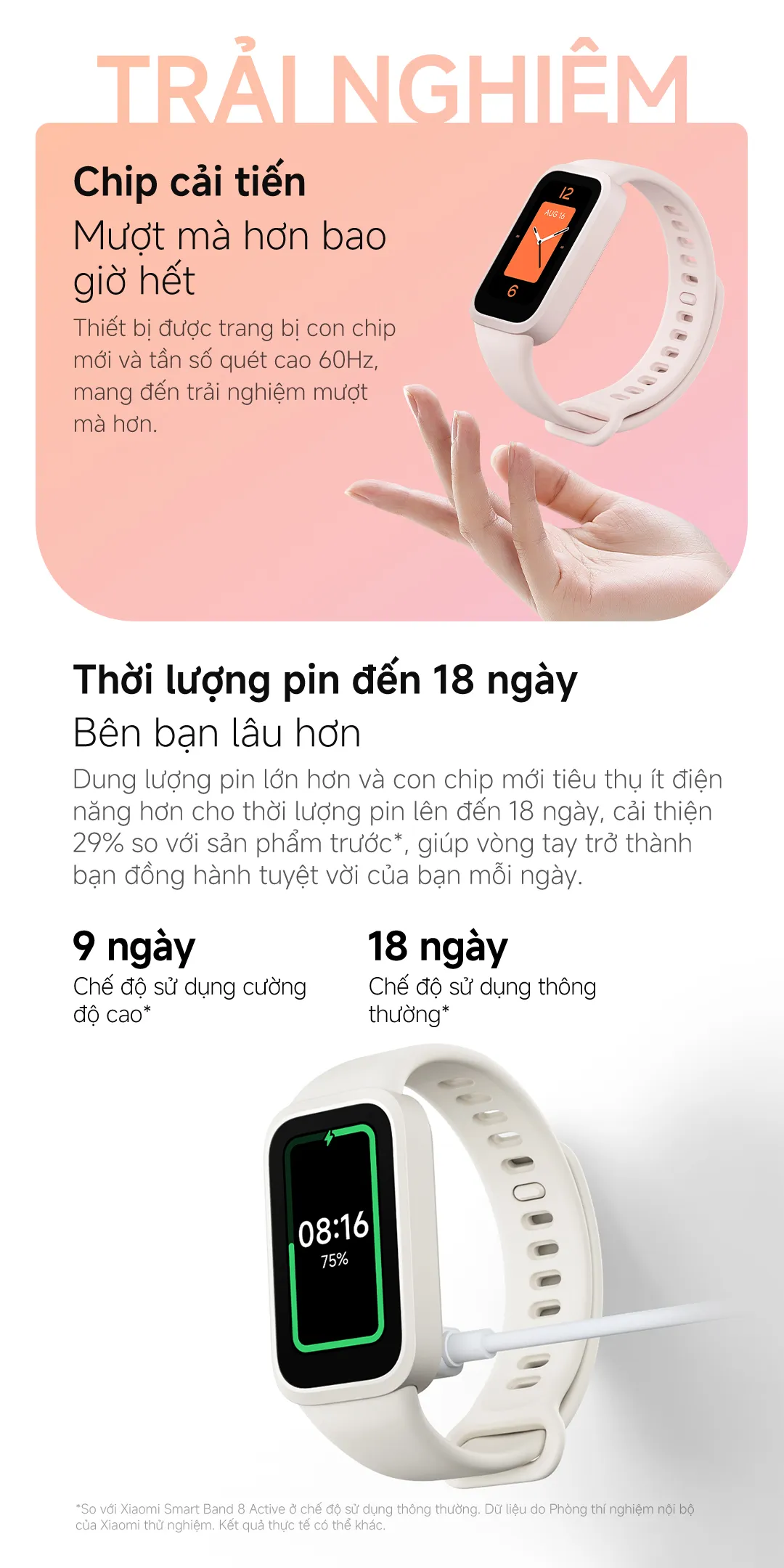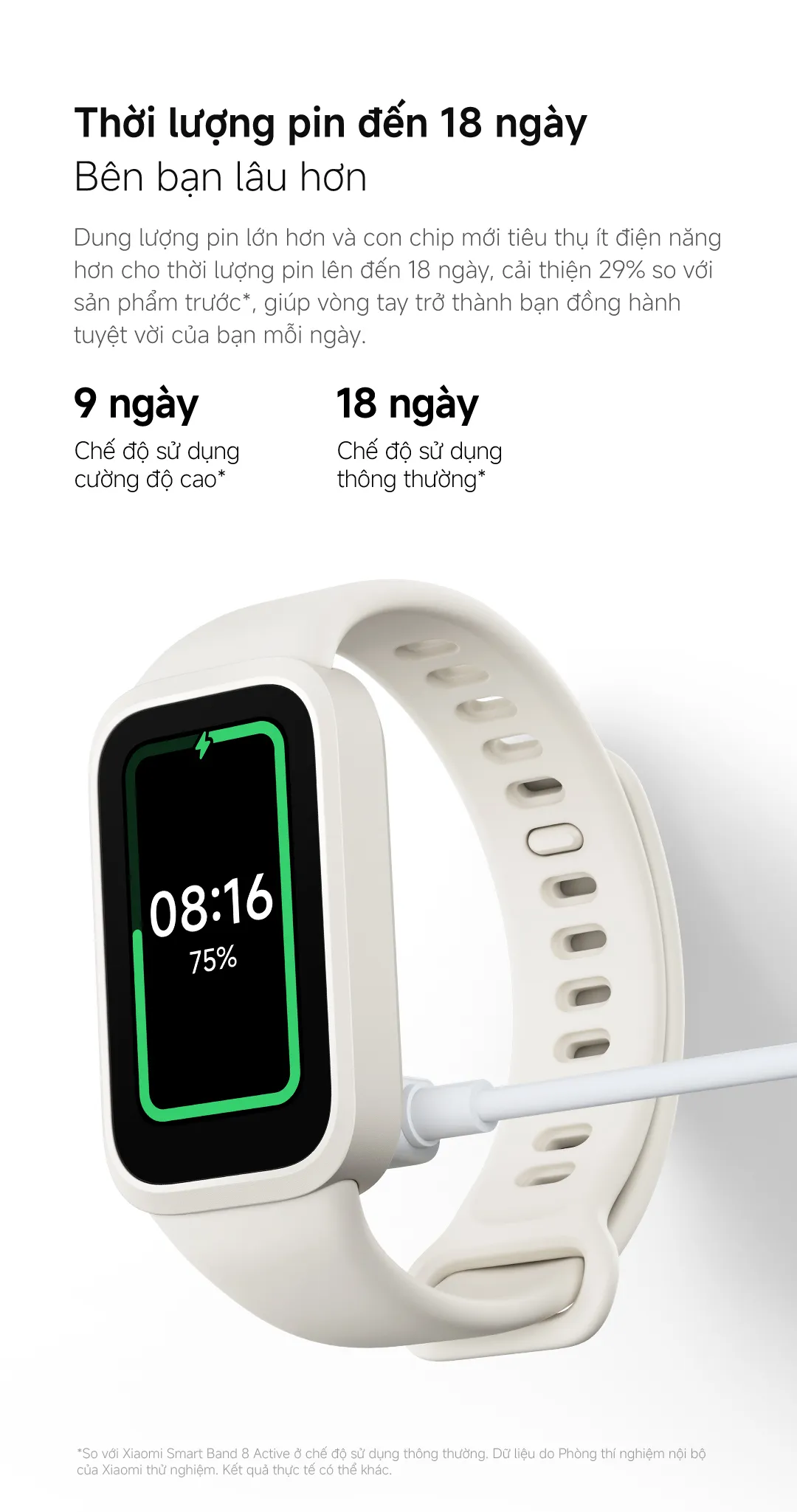 Một trong những ưu điểm lớn nhất của Xiaomi Smart Band 9 Active là thời gian sử dụng pin lên tới 18 ngày khi hoạt động bình thường. Dữ liệu này được lấy từ phòng thí nghiệm nội bộ của Xiaomi, phản ánh mức tiêu thụ năng lượng thực tế trên thiết bị. So với phiên bản trước (Smart Band 8 Active), Pin 18 ngày mang lại sự cải thiện đáng kể lên tới 29%.
