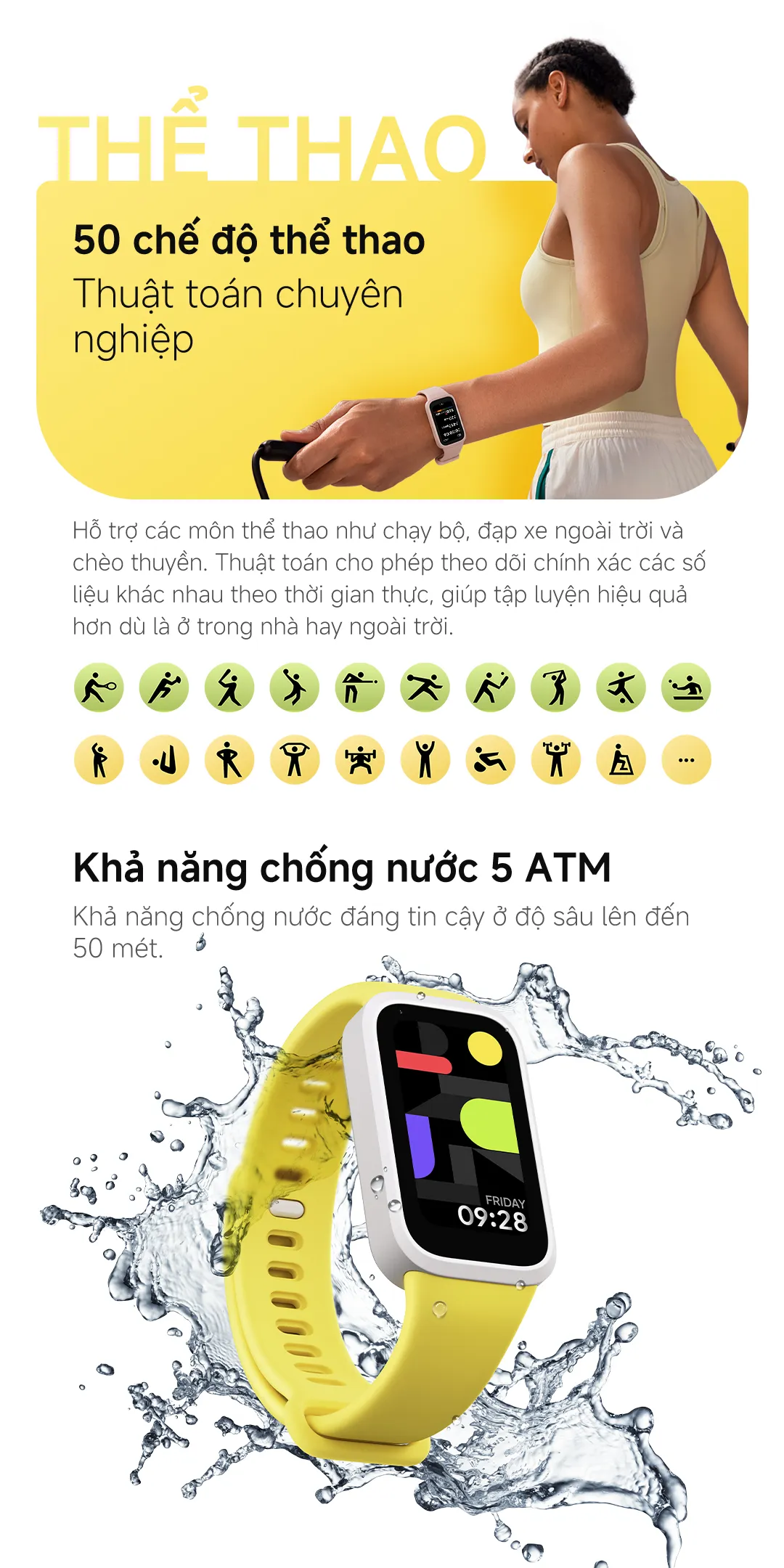 - Hỗ trợ 50 chế độ thể thao, cung cấp dữ liệu chính xác và cảnh báo sức khỏe.