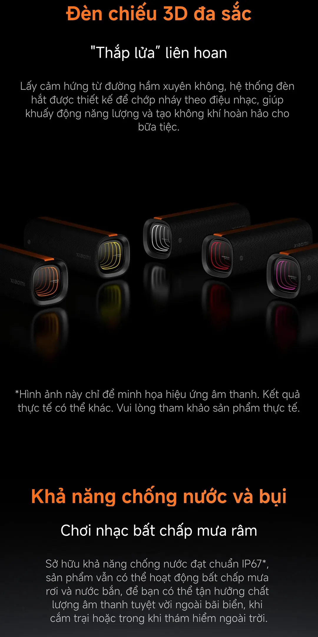 Với tiêu chuẩn IP67*, loa có thể chịu được mưa rơi, nước bắn mà vẫn hoạt động bình thường. Điều này làm cho Xiaomi Sound Party trở thành người bạn đồng hành lý tưởng cho các hoạt động ngoài trời như cắm trại, dã ngoại hay thậm chí là tiệc tại bãi biển.