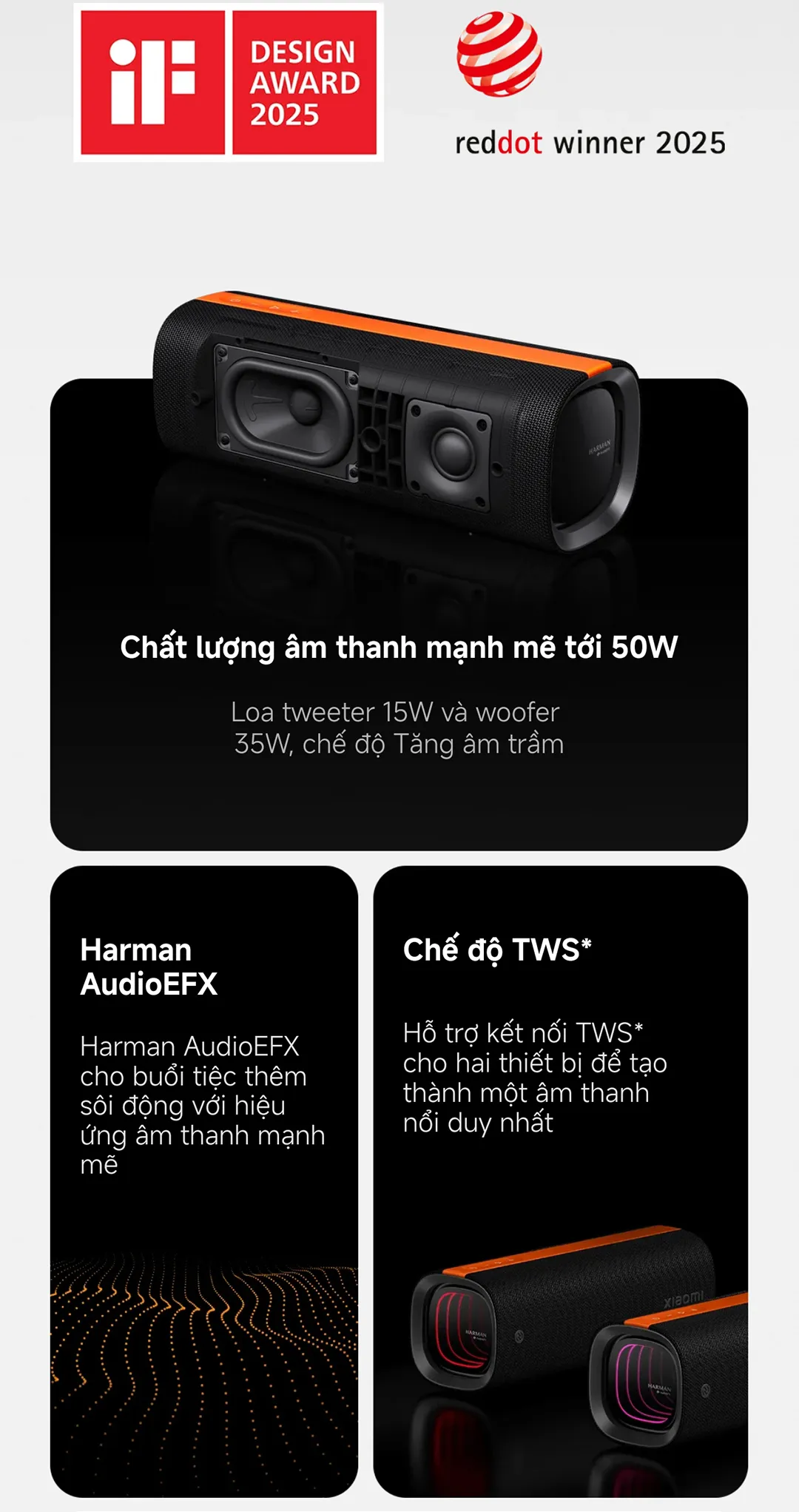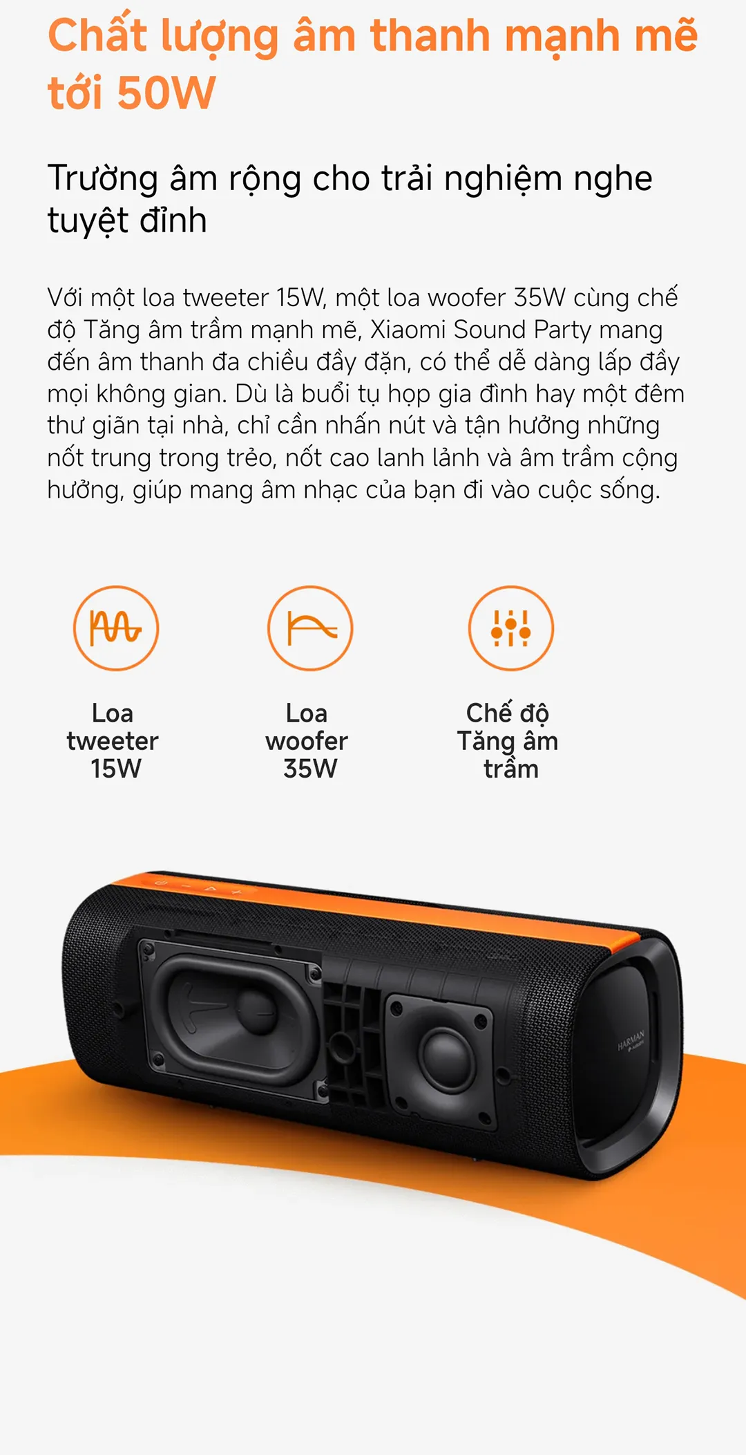 Xiaomi Sound Party | Chất lượng âm thanh mạnh mẽ tới 50W | Loa tweeter 15W và woofer 35W, chế độ Tăng âm trầm | Harman AudioEFX cho buổi tiệc thêm sôi động với hiệu ứng âm thanh mạnh mẽ