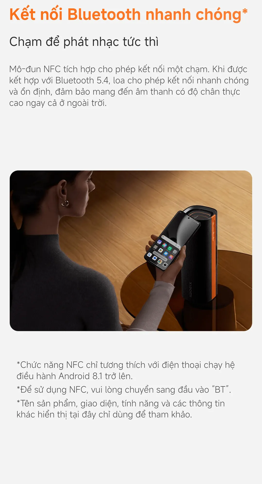 Xiaomi Sound Party còn có micrô tích hợp, giúp bạn trả lời cuộc gọi mà không cần lấy điện thoại ra khỏi túi. Đặc biệt, tính năng NFC cho phép kết nối một chạm với các thiết bị Android 8.1 trở lên, đồng thời hỗ trợ Bluetooth 5.4 để truyền tải dữ liệu nhanh chóng và ổn định.
