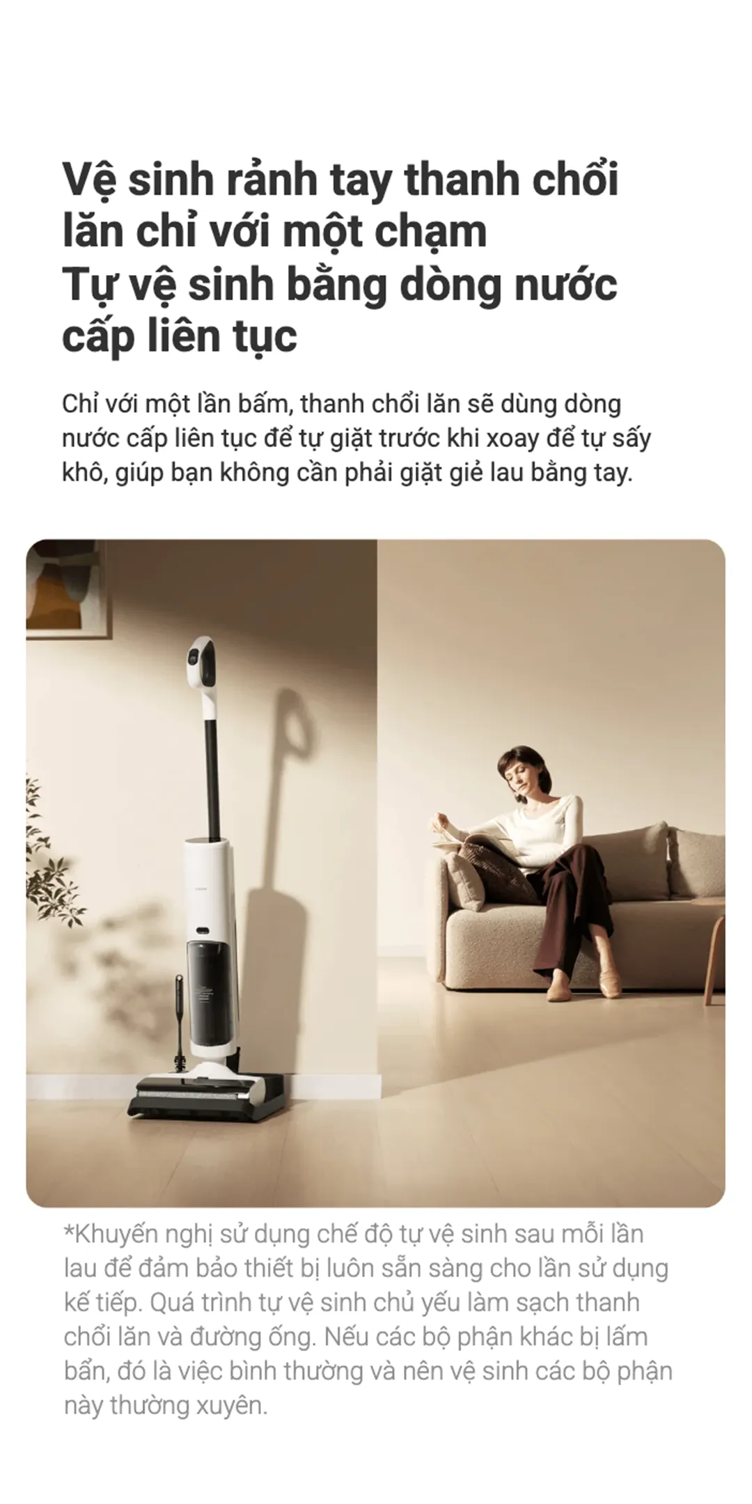 Tính năng “điểm 4” của máy – tự vệ sinh trong khi lau – thực sự là một bước tiến lớn. Khi bạn bật chế độ lau, dòng nước sạch sẽ chạy liên tục qua thanh chổi lăn, ngâm lại bề mặt và ngay lập tức rửa sạch tạp chất. Sau đó, công cụ làm khô tự động giúp thanh chổi trở nên khô ráo trước khi tiếp tục hút bụi.