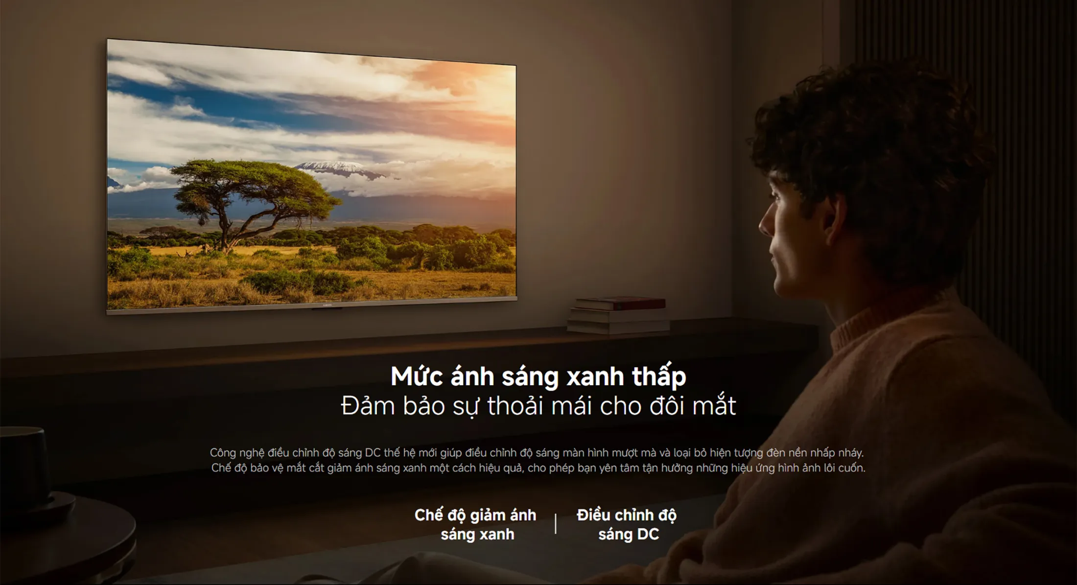 - Công nghệ điều chỉnh ánh sáng xanh: Khi màn hình hiển thị nội dung 4K HDR, lượng ánh sáng xanh được giảm xuống mức an toàn cho mắt. Điều này đặc biệt quan trọng khi bạn dành nhiều giờ trước TV.