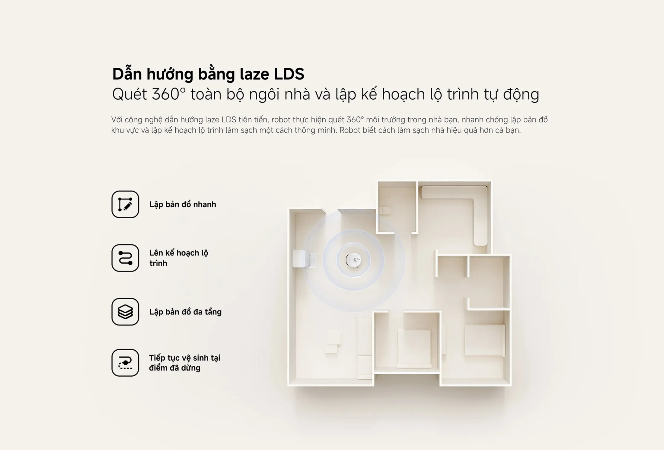 • Lập bản đồ nhanh: Công nghệ laze LDS (Laser Distance Sensor) giúp robot quét 360° toàn bộ không gian, tạo ra bản đồ chính xác trong thời gian ngắn.