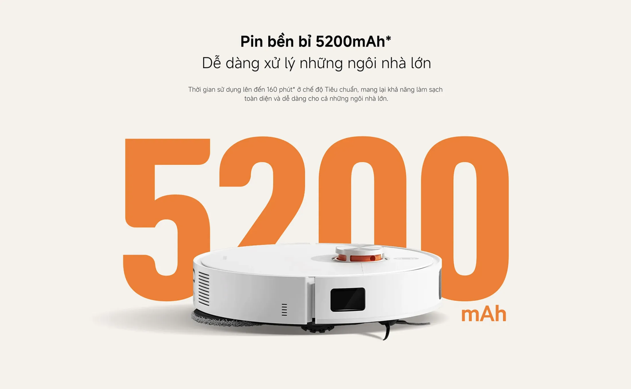 • Pin 5200mAh*: Đảm bảo thời gian sử dụng lên đến 160 phút ở chế độ tiêu chuẩn, giúp robot hoàn thành công việc mà không cần phải dừng lại thường xuyên.